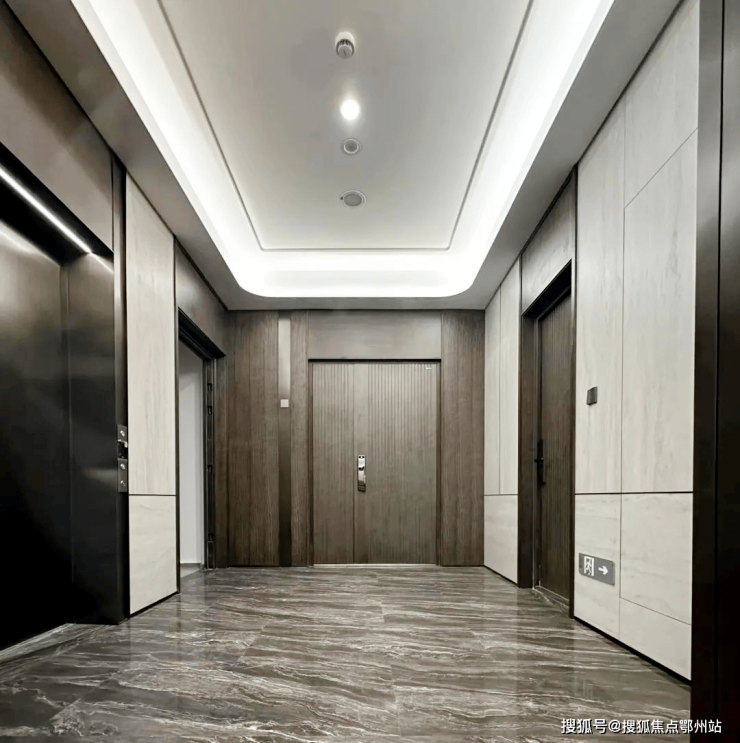 挑高入户大堂也非常吸睛,大面积岩板,两侧动线镶嵌金属线条。