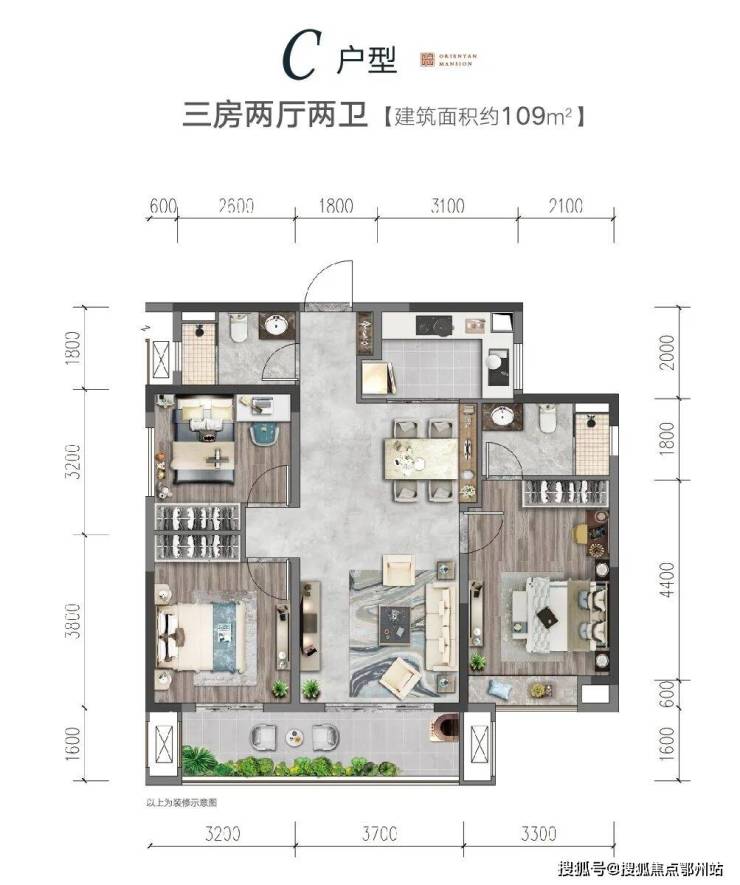 首先来看第一个户型, 建面约109㎡舒适性三房,三房两厅一厨两卫的全明户型。