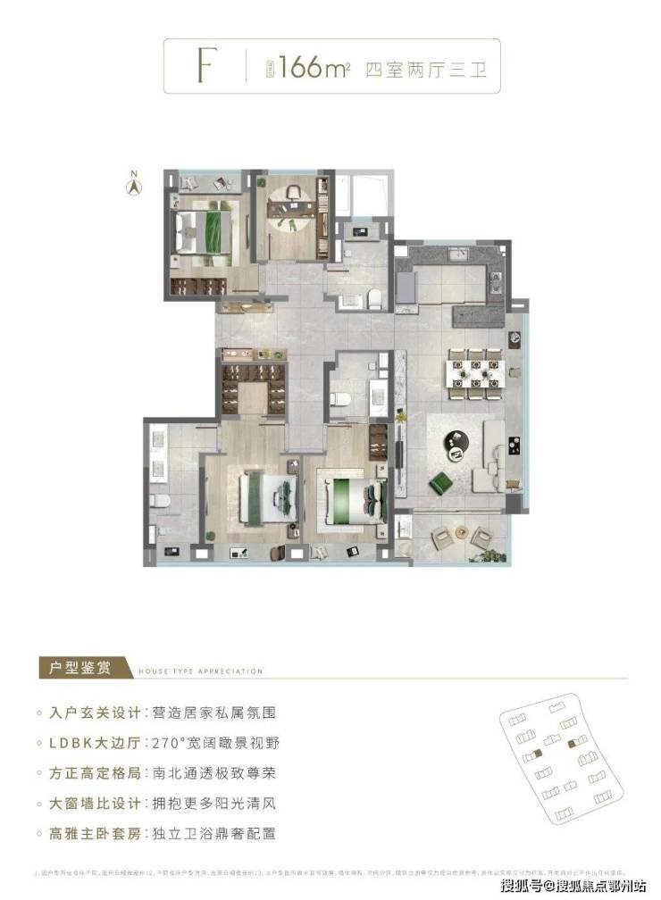 建面约166㎡4房2厅3卫,做到了 3+1开间朝南+双套房设计+卫生间干湿分离,是“一步到位”的进阶改善4房!