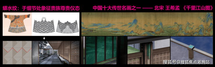百吨极品黑山石与特选花木的极致交融,无一不呈现出项目的尊贵典雅。 二、五重形态,引水入园,打造标杆园林范式 项目各处细节采用蟒水纹凸显尊贵,择取中国传世名画北宋王希孟的《千里江山图》中的青绿之韵原色,点缀在公区的软硬装材质中,更彰显东方传承意韵之美。