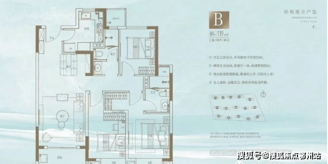 B户型 | 119平米【3房2厅2卫】√正三房设计,精致生活动线√三开间朝南,全屋双卫√南向卧室配置飘窗,提高空间使用率
