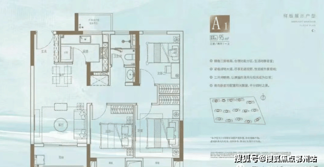 A1户型 | 95平米 【3房2厅1卫】√南北通透,三开间朝南√紧邻绿地大道,享无遮视野√卧室配置飘窗,提高空间使用率