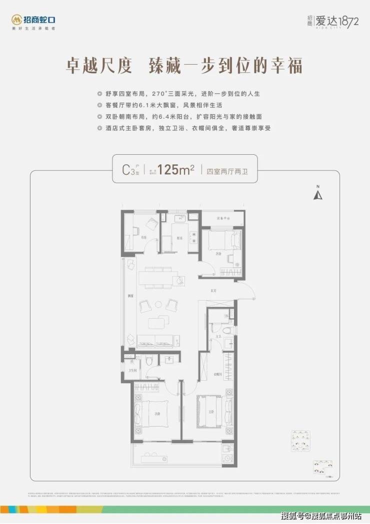 在户型上,其中建面约106㎡户型完美契合年轻人的置业需求,无论是LDKB一体化设计、正三房+双卫的格局,还是约3.5南向大开间、“1+X”创变空间的尺度,都做到了改善级空间感;而建面约125㎡大四房户型则以270°三面采光、奢阔客餐厅、双卧朝南等创新布局,为置业者实现一步到位的生活。