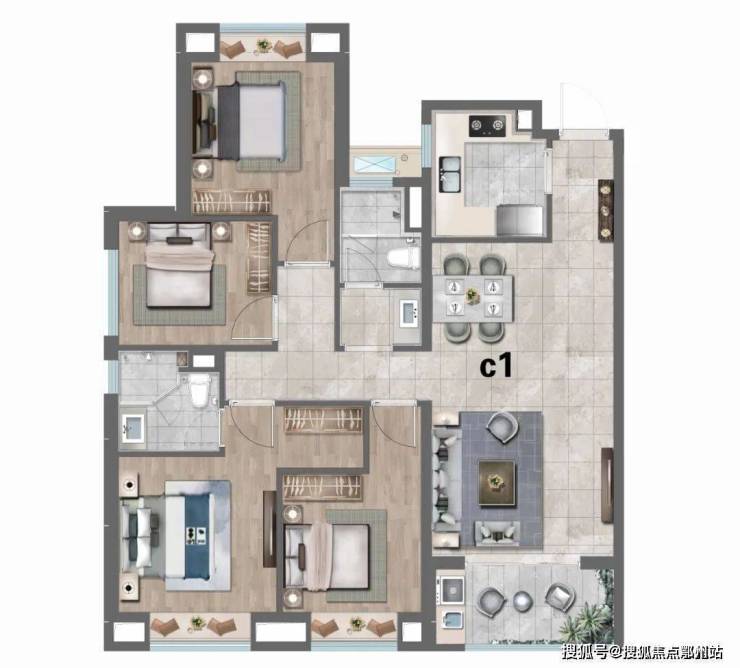 做到了三开间朝南+三卧室带飘窗+主卧套房设计+卫生间干湿分离+动静分离+南北通透,功能非常齐全的4房户型。