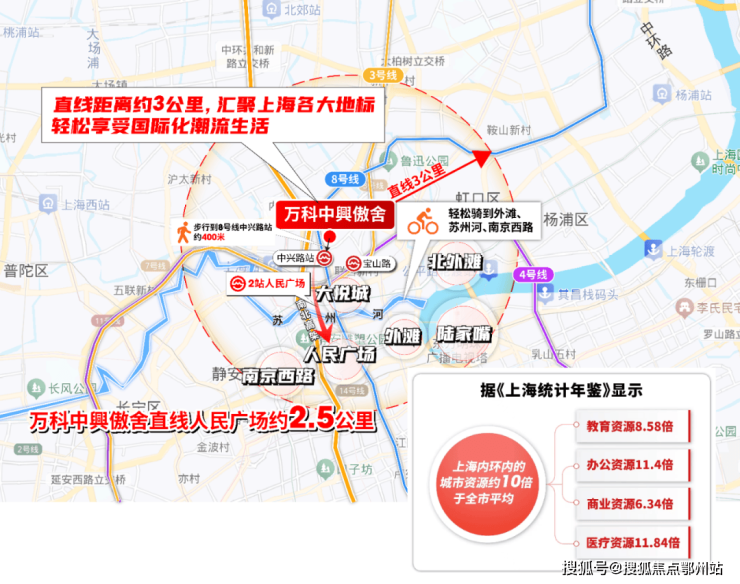 离传统市中心越近,资源密度越浓。中興傲舍离8号线中兴路站步行只有约400米,2站人民广场(直线距离约2.5公里),直线距离约3公里覆盖南京西路、静安寺、南京东路、陆家嘴等核心板块,中興傲舍与市中心资源深度绑定。