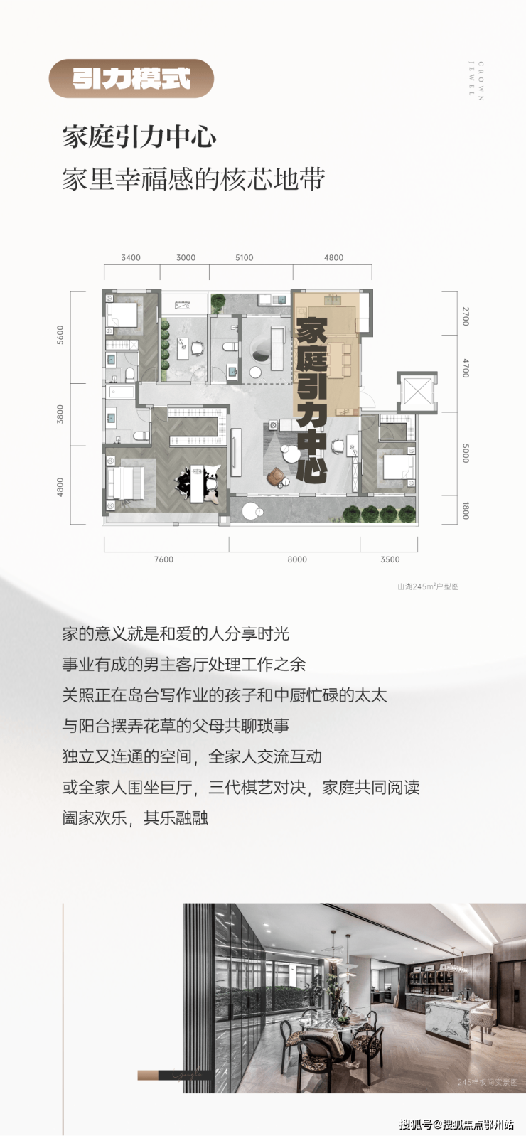 山湖245将空间魔法迭代,公区更新升级, 创新“约100㎡LDKB至尊空间”——即“景观阳台-客餐厅-社交化厨房+岛台”组合为中心而展开的关系场,约占比整个户型空间的41%,将家庭的主要生活场景和主人的社交场景都放到了这约100 ㎡的空间里。
