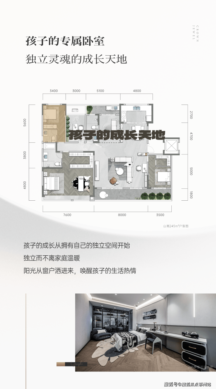 越成功的家庭,越注重孩子教育,更注重全面素质和品格的培养,注重家庭教育和言传身教。山湖245约20㎡孩子卧室套房,独立成长必要的物理空间,予孩子更多尊重和自由,滋养出独立自在的灵魂。卧室之外,专定近17㎡成长空间,为孩子成长的不同阶段提供不同培养场景。