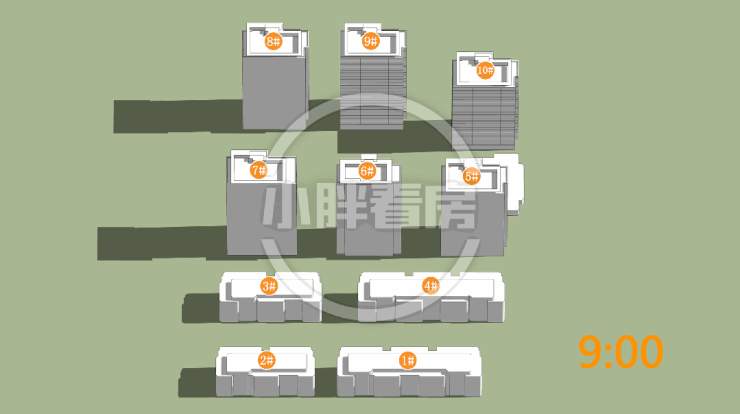 9#10#中低层受遮挡。就具体遮挡时间而言,9#全天不同时段均会受到遮挡。10#主要在中午和下午受5#6#遮挡。