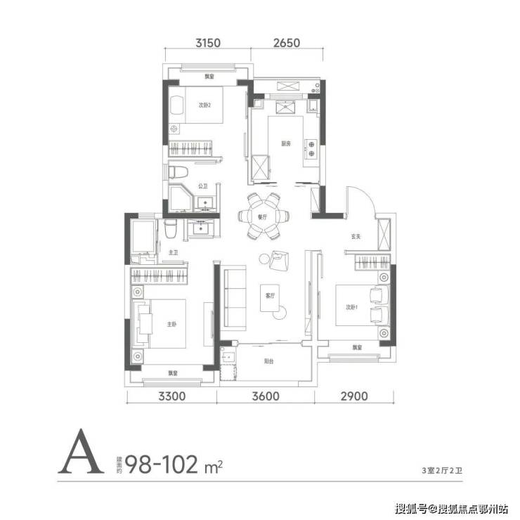 建面约100㎡是实打实3房,客厅宽度达3.6米,主房间宽达3.3米,连北面小房间也能放1.5米宽的床。