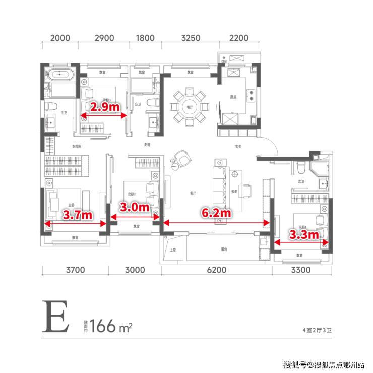 南向三卧,双套房设计,主卧面宽约3.7米,带衣帽间、淋浴、浴缸。