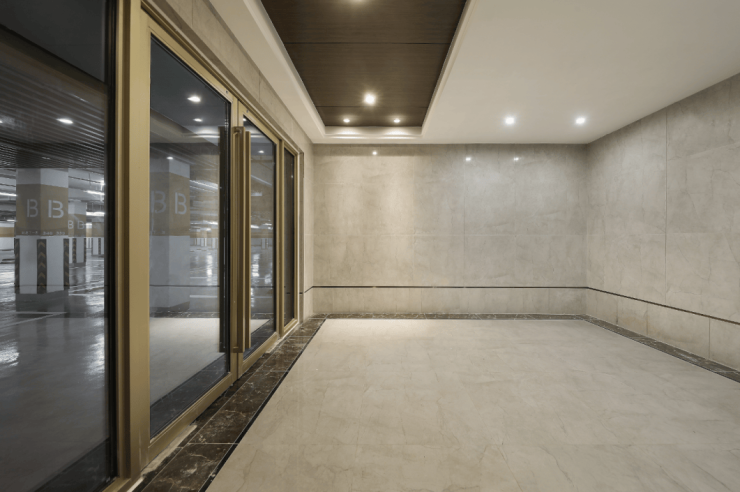 有别于常规全涂料或全铝方通天花设计方案,地下大堂选择木纹铝板为主涂料相辅的表现手法。在较为宽裕的层高基础上,吊顶增设了木质纹理装饰面,一方面满足防潮防霉的特性,另一方面也提升了价值感。墙面瓷砖运用错缝铺贴手法,瓷砖大板与标准板结合使用,让整体空间更具装饰丰富性,为业主提供独有的归家仪式感。