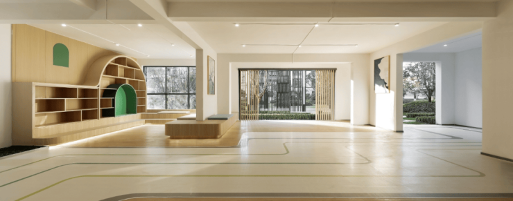 场地核心景观同时配备儿童娱乐区,融入“东方五感”——感天地、感四季、感闲逸、感童真、感人伦的精神,关注全生命周期的健康生活体验。分别以花、月作为主题布置亲子儿童空间,同时配备了多龄段活动区域,其中有适合低龄互动的地垫、较为低矮的钻洞设施,以及具有冒险感的攀爬坡与滑梯、景墙组合等适合高龄段儿童设施。在自然环绕下,寓教于乐,亲子共成长。