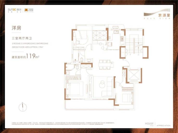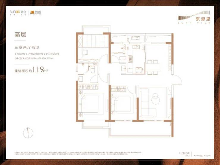 建面约119㎡三室两厅两卫▼