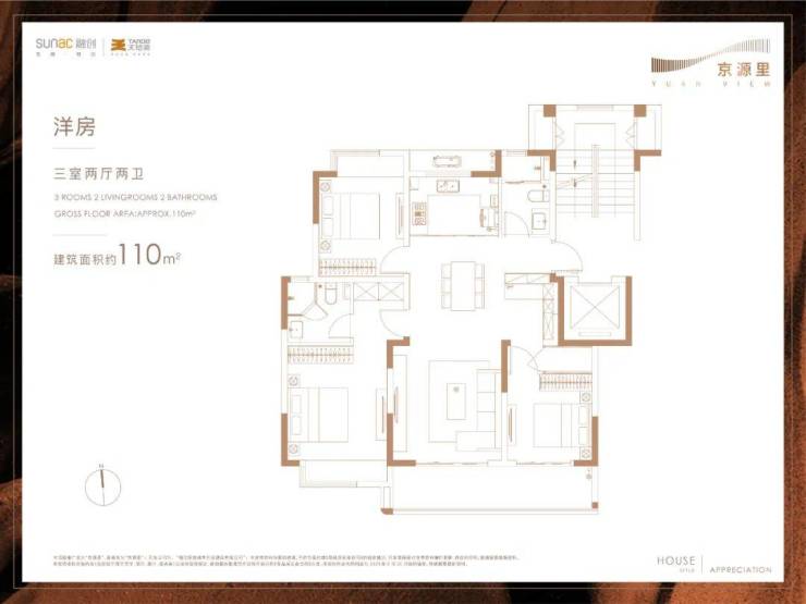 建面约110㎡三室两厅两卫▼