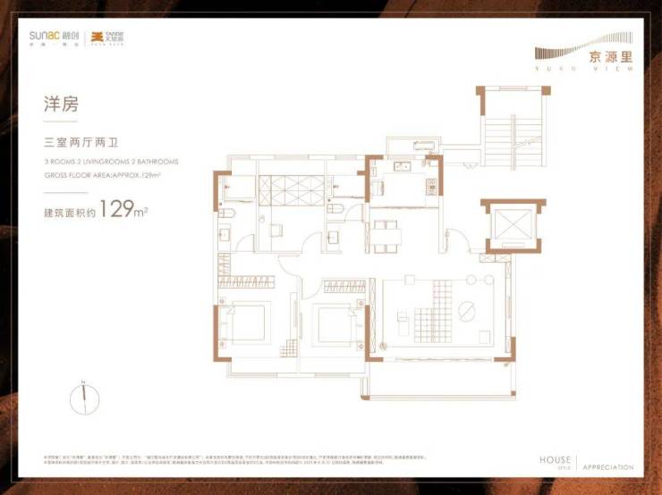 建面约129㎡三室两厅两卫▼