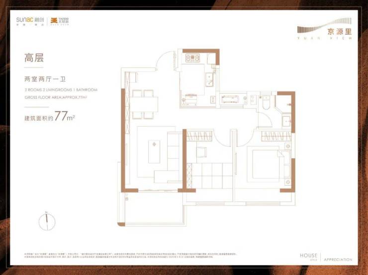 建面约77㎡两室两厅一卫▼
