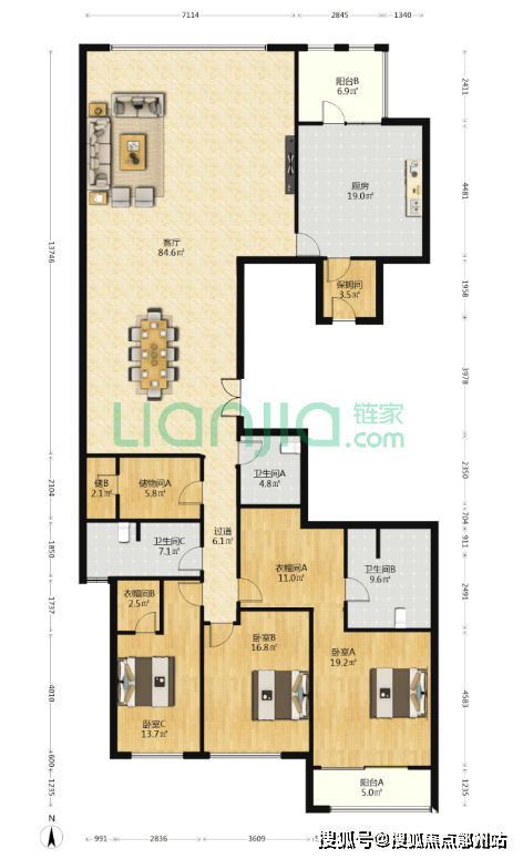 二期御苑目前主力挂牌的是140㎡左右的户型,格局和一期差不多,也是南北通两开间朝南,但功能性只有2房,尺度很阔绰,舒适度较高。