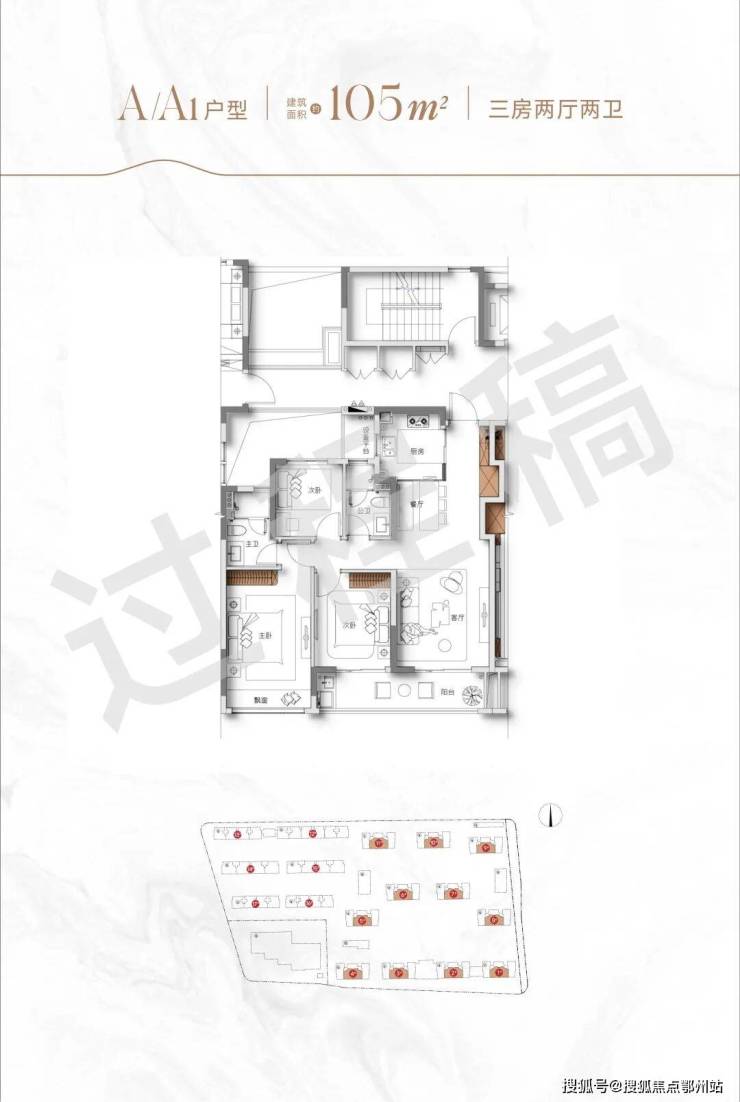 建面约105方三房两厅两卫户型: