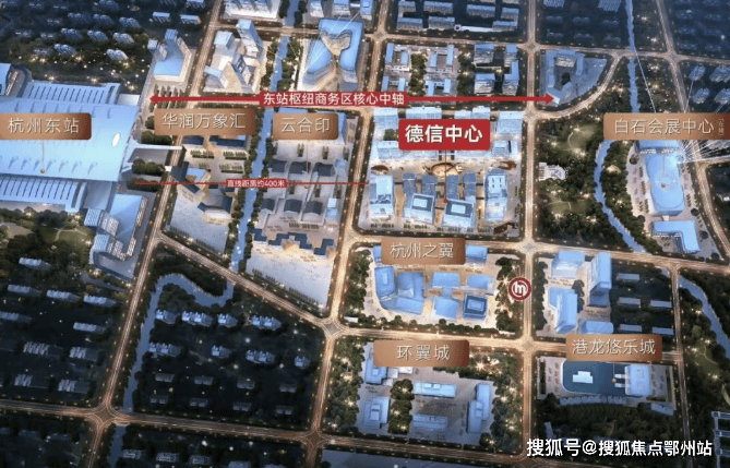 德信中心与杭州东站直线距离仅400米,由东站出发,基本形成长三角2小时经济交通圈,高效往返长三角地区。占据商务启点最有利的价值高点。目前所在的东站枢纽经济示范区,已经汇聚德信集团、华威集团、万事利等企业总部,吸引和聚集一批长三角地区龙头企业总部,形成总部经济集群。德信中心与杭州之翼、环翼城、云合印等组成约62万方德信商业集群,坐揽万象城汇、东站西子国际、港龙悠乐城等商业,核聚城东新城繁华资源,激活板块经济活力,造就区域内难得一见的门户封面。