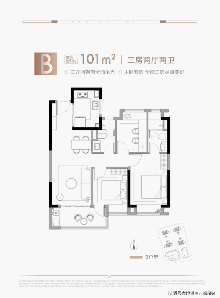 建面约101㎡3房2厅1卫户型(中间套)、建面约102㎡3房2厅1卫户型(边套),均做到了 三开间朝南+双朝南卧室带飘窗+动静分离,采光面拉到极致的3房。