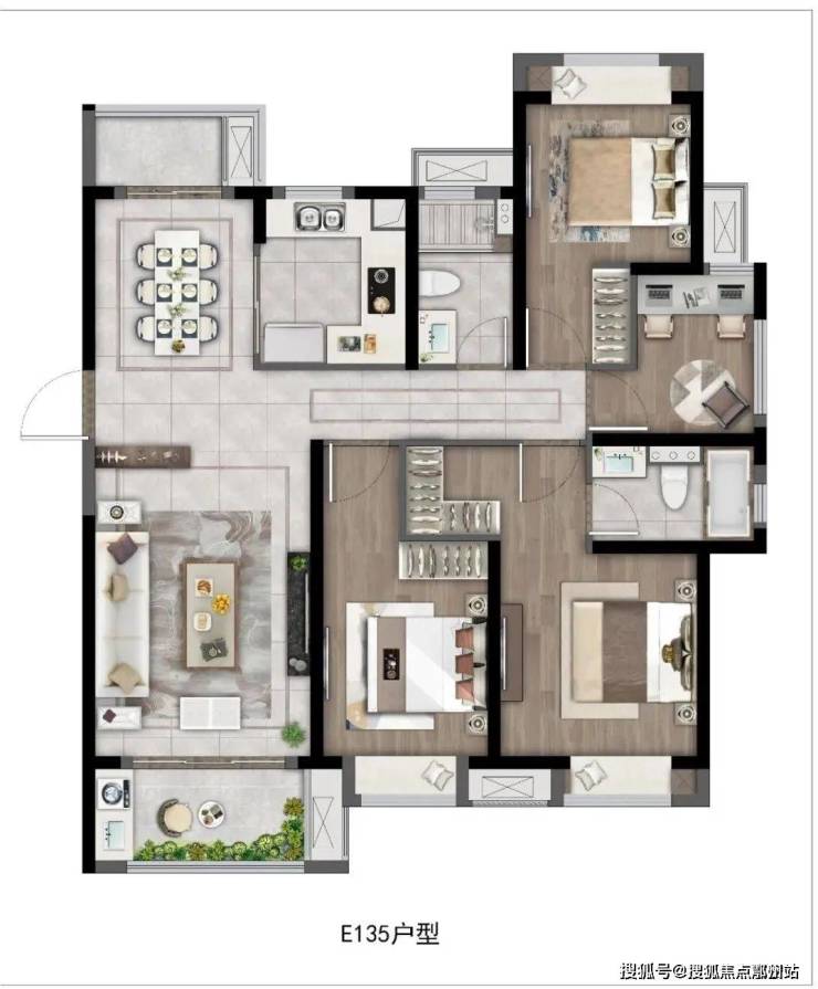 建面约135㎡4房2厅2卫,做到了三开间朝南+双卧室朝南+主卧套房设计+南北通透+动静分离+南北双阳台,