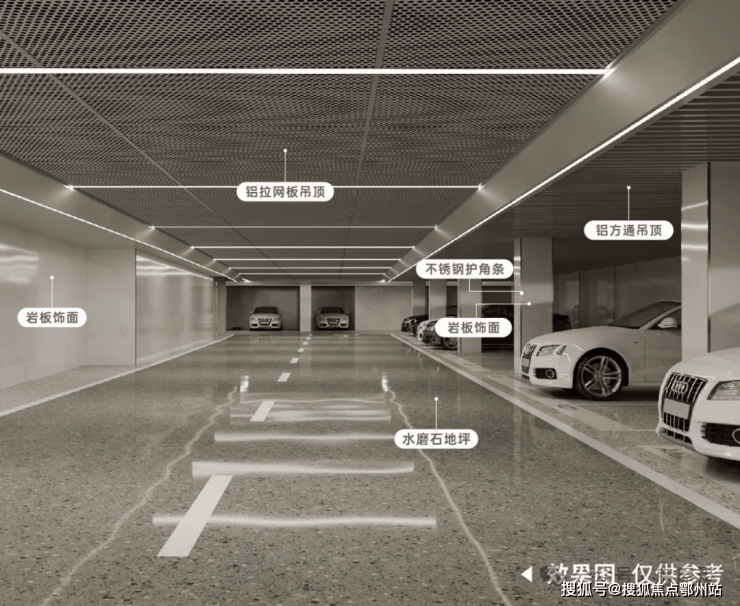 项目车库也是延用了润和滨江湾的设计,水磨石地坪,车位上方铝方通吊顶,车道上方铝拉网板吊顶,墙体采用岩板饰面……极具奢华感和艺术感。