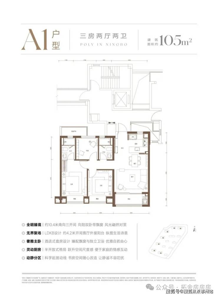 建面约105㎡A2户型,南向三开间,LDKB一体化设计,灵动空间适配年轻家庭;
