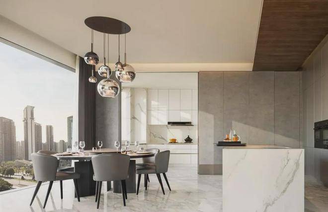 整體營造出現代輕奢度假氛圍,以FENDI CASA滲透於空間各個細節之中。88方的超大客餐廳,270度瞰景視野,19米的雙面採光,客廳都是L型採光的“無柱轉角落地玻璃廳”。每一場輕歌曼舞的派對,背景都帶著“H”標的奧體地標群。