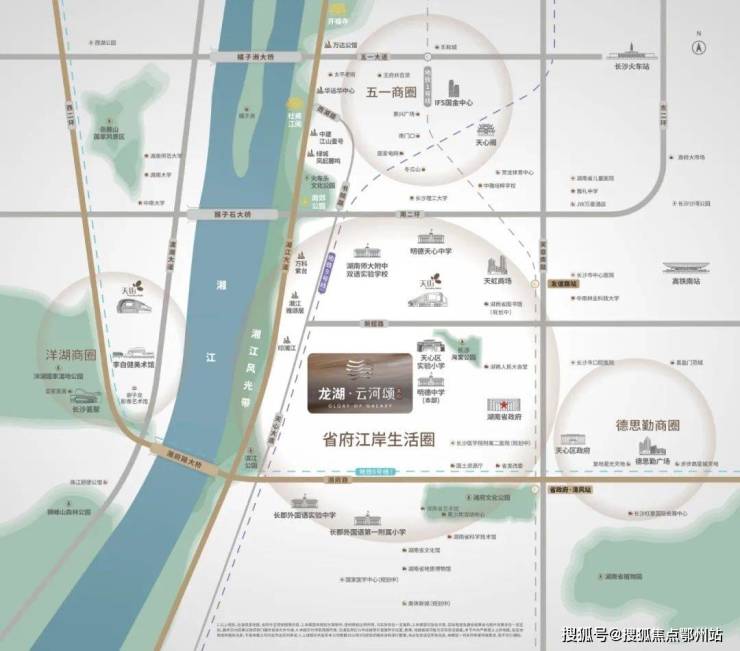 省府江岸豪宅生活区,距离省政府约900米,位于天心大道和新韶西路交汇处,拥有不可复制的主城江岸地段、成熟资源配套和顶级政芯圈层,首开建面约193-240㎡,属龙湖体系内最高端的云河系作品