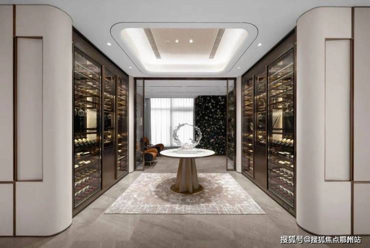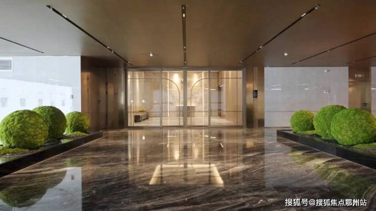 更多的人都是开车回家,地下大堂和地面大堂同等重要,下楼来到地库, 星光顶大堂,层高很舒适,是永生苔藓的绿意盎然, 墙面岩板,吊顶铝板,还用石材包柱内嵌水晶灯柱,这样的配置在2万+大平层中极为罕见。