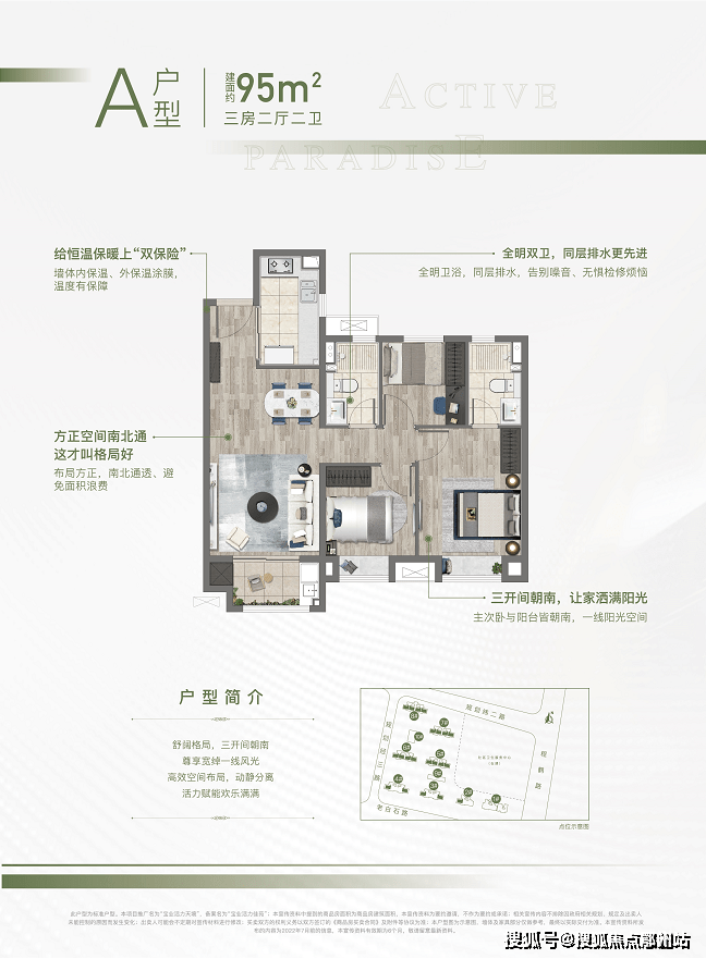 约95平三房两厅两卫,做到了 三开间朝南+主卧套房设计+南北通透+动静分离+双朝南卧室带飘窗,是非常棒的3房户型!