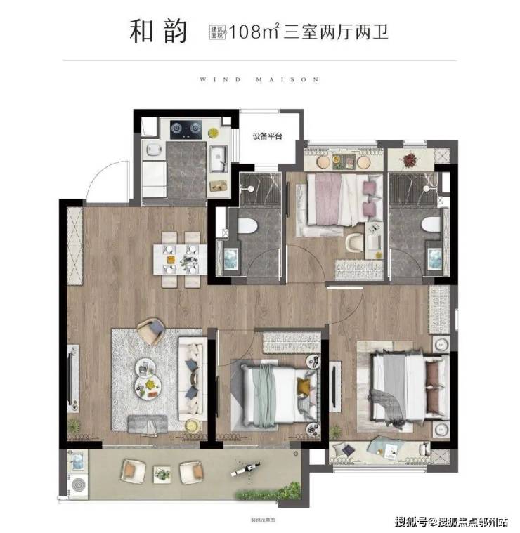 建筑面积约108㎡户型:布局方正、南北通透, 南向三开间搭配约6.7米奢阔双阳台,主卧尊享套房设计,让生活更具尊贵感和私密性。