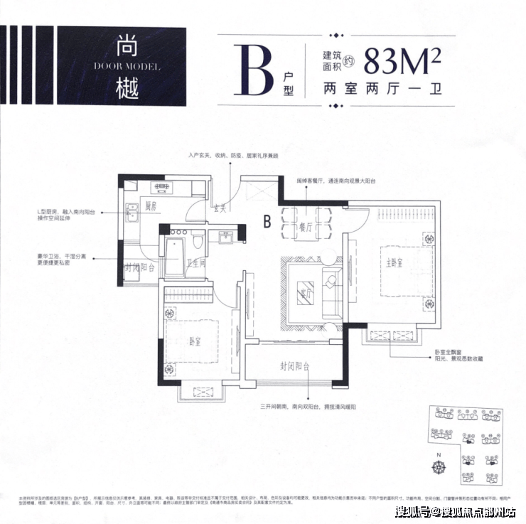 户型做到三开间朝南, 门口的一处入户玄关可作为收纳空间,让家中物品摆放更充裕; 卫生间为干湿分离设计,避免尴尬,让家人洗漱更便捷;两个卧室均带有 飘窗设计,主卧采用则全飘窗,居住舒适度更高。