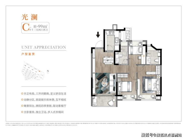 建筑面积约99㎡大三居的户型设计,远超同面积段平均水准: