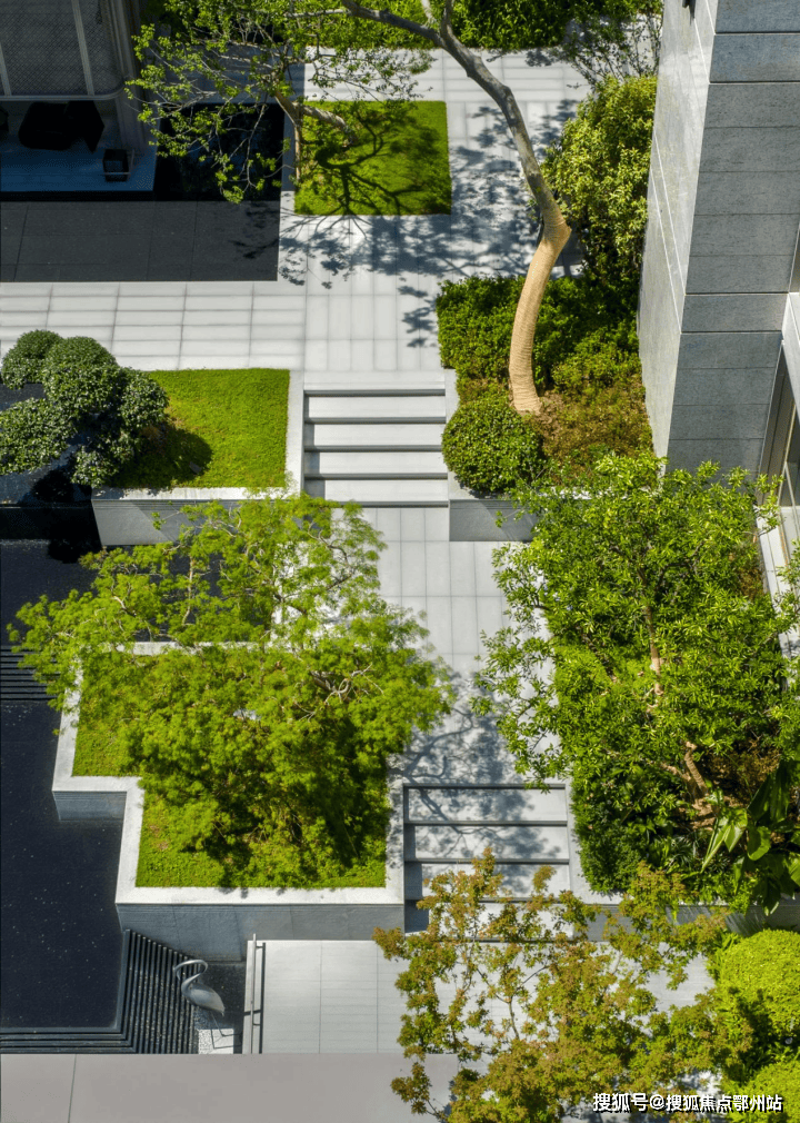有背山必须傍水,从小区正门的 独立高端会所 进入园区后,之江壹品特意作了 退进式梯度入口 ,中心引入 意式跌水水景 ;从两侧围着水景、顺着山势的缓坡台阶漫步往上,在跌水的终端是 卡洛斯卡帕式的雕塑 出水口和一棵中型落叶乔木作纪念性空间;