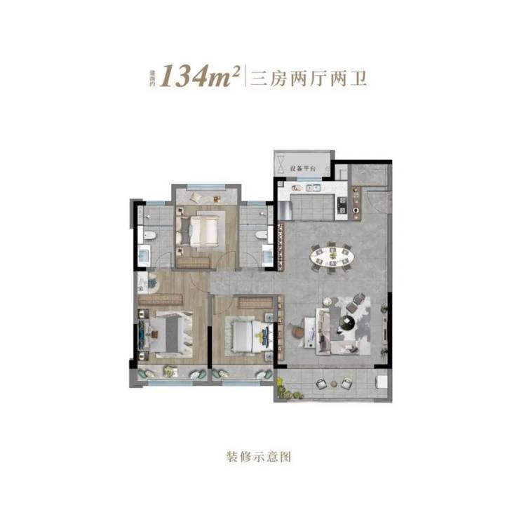 在户型方面,景玥府主推建面约108㎡三室两厅两卫与建面约134㎡三室两厅双卫两大主力户型。其中,建面约134㎡户型位于15#新品楼栋,占据园区绝佳位置,拥享一线观河视野。空间设计对标一线城市豪宅标准,打造约5.4米宽南向大横厅,扩容采光面,还设有岛台空间,采用LDKG一体化设计与3+X灵动空间,满足高端家庭多元化生活场景需求。