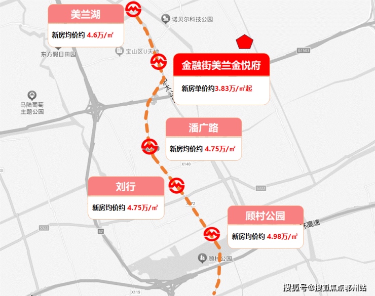 从7号线来说,往后一站的美兰湖,比金悦府贵了约8000元/㎡+,往前几站的潘广路、刘行和顾村公园,都比金悦府贵了1w/㎡上下!