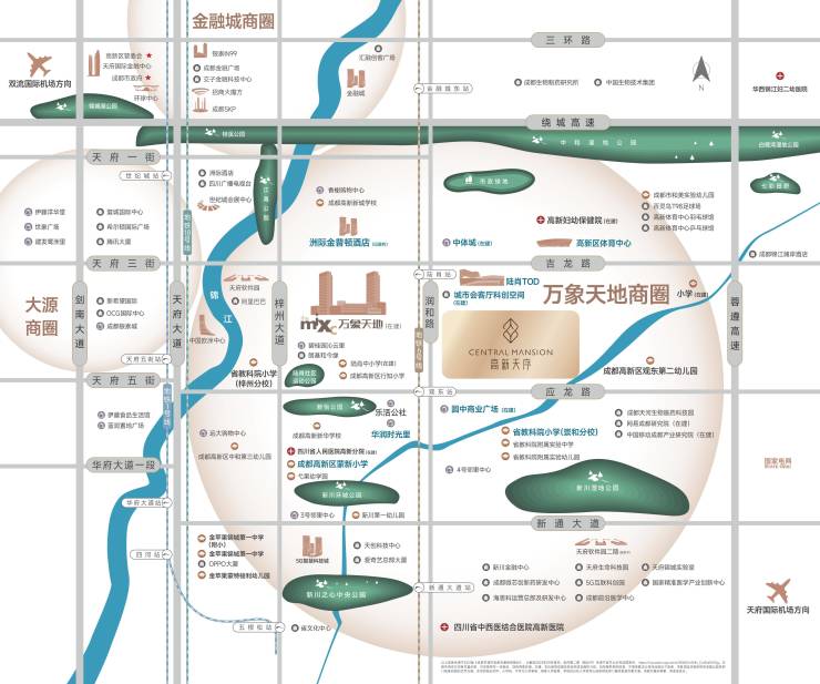半径约500m范围可享万象天地(在建)、洲际金普顿酒店(已签约)、中体城(在建)、高新体育中心、E-park公园(待建)、省人民医院高新分院(待建)