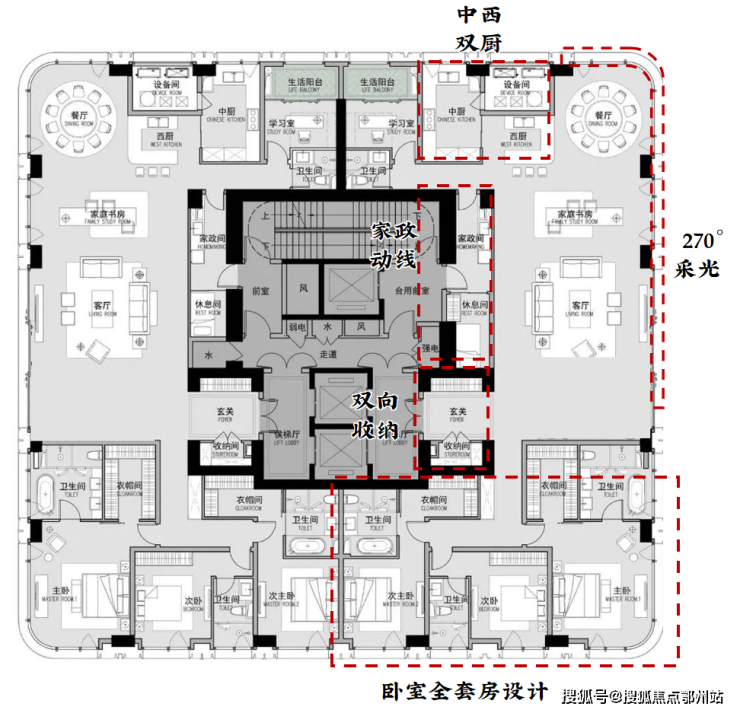 针对高净值客户,私密性显然是最重要的。电梯双开门设计,家政服务人员也有单独出入动线,尽可能减少对业主的影响。
