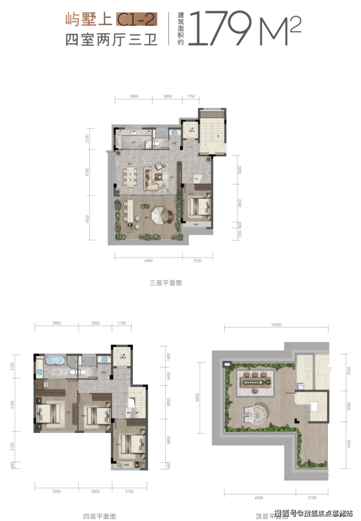 云檐里给出了下叠建面约165方、上叠约170方和上下叠约179方这4款主力户型。