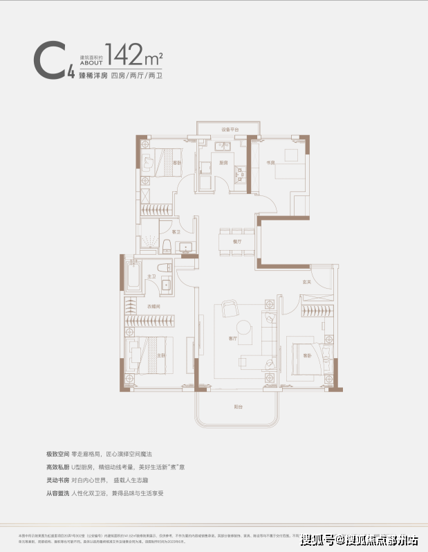 建面约140㎡四房:三开间朝南户型,南北通透,采光条件优质,客厅明亮宽敞,彰显大气布局。