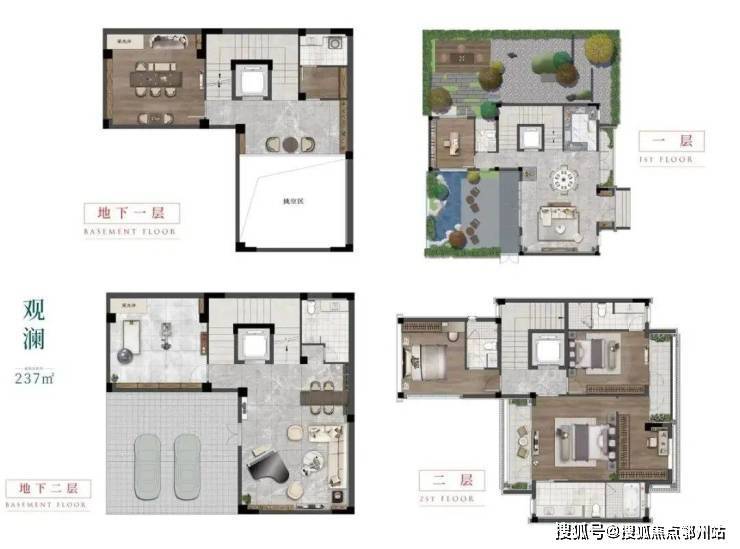 叠墅分为上下叠,1、2楼为下叠,自带地下室与前后院子。