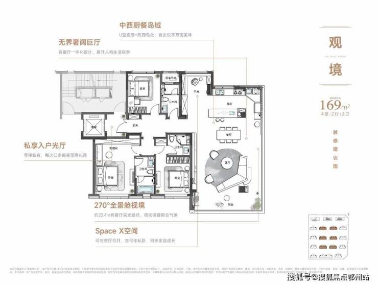 同样备受好评的 建筑面积约169㎡高配大四房户型,大宅尺度气场全开,充分满足“三代同堂”、“二胎家庭”不同阶段的居住需求。 两大套房卧室并立朝南,让每位家庭成员拥有奢适与格调完美融合的至臻享受; LDKB一体无界奢阔巨厅,打造家族社交场域,居家待客从容有度; 270°全景舱视境,让清风暖阳和四季的风景铺满每一处空间。