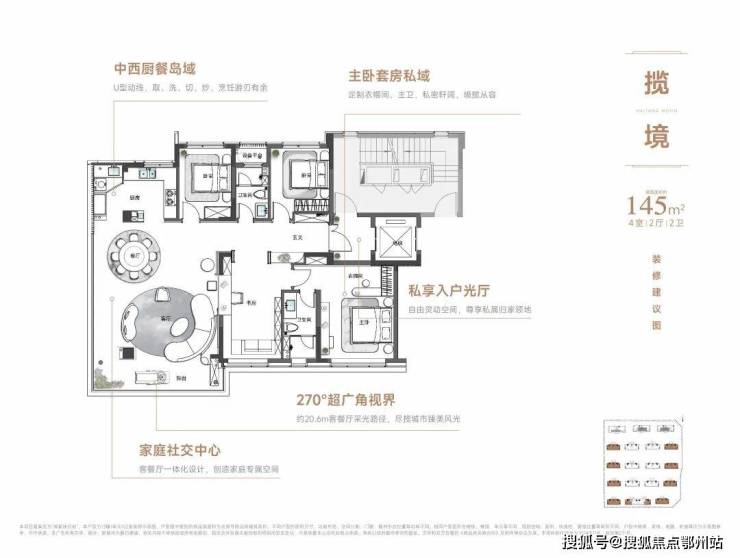 建筑面积约145㎡四房两厅两卫户型,更是以爆款之姿,赢得了圈层客户们的高度认可, 约270°超广角视界,邀清风、明月入室; 约20.6米长度的一体化餐客厅,阔厅宽尺,连通阳台,全明通透社交会客更加的从容不迫; 中西U型岛厨,预留双开门冰箱位置,让烹饪拿手好菜更加游刃有余;超阔套房主卧,赋予居者尊崇私享领地,让生活充盈舒适与美好。