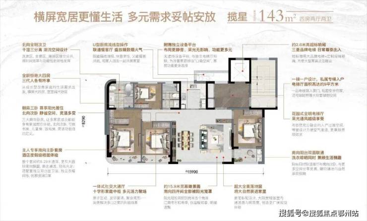 (1)建面约143㎡南向大面宽揽星户型。这个户型,是东方云锦首次面世的全新户型,无论瞰景尺度还是多元功能都值得深品。约15.9米南向四开间,在嘉善天际线铺开一席IMAX大视界。四房宽居的改善格局,让业主夫妇、父母、孩子,都能拥有独立房间,每一位家庭成员都能享受舒适与从容。独立入户全明电梯厅、额外附赠设备平台、干湿三分离的北向次卫,每一点拎出来都用心满满、超级实用。