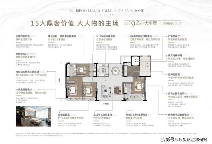 (2)建面约192㎡的震撼大平层望玥户型,接近20米的南向面宽,视野宽阔,勾勒出峯层奢宅的空间向往。超60㎡无界大通厅设计,带多功能岛台的开阔厨房,满足精英层宴请待客、亲子互动的日常社交需求。豪华双套房配置与全明3卫设计,匹配多家庭成员的休闲奢享和起居私密性。