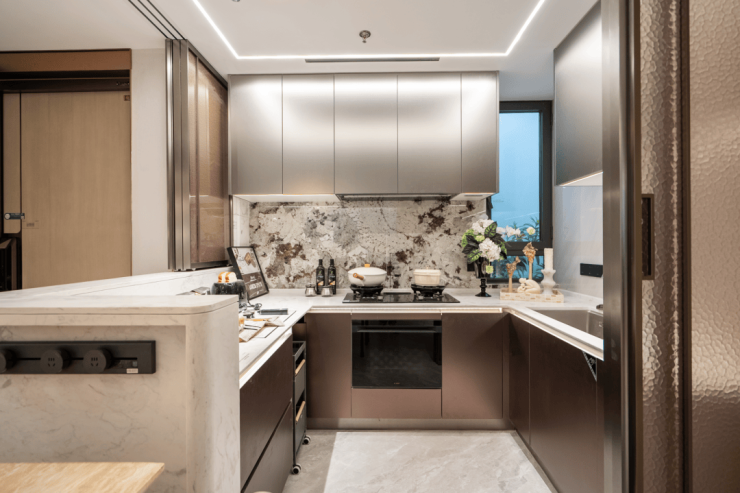 常规厨房平台无法利用的空间死角,在这里也被合理使用,节省出 1-2㎡的收纳空间,实打实的获得了房价价值。