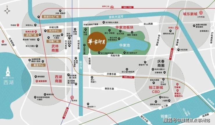 项目位于华家池板块,凯旋路与华池北路交叉口,这个板块是2013年杭州的地王,目前板块内的豪宅均已交付,二手房价均已达到8-10万,可以说这里是整个武林范围内最新并且规模最大的豪宅圈