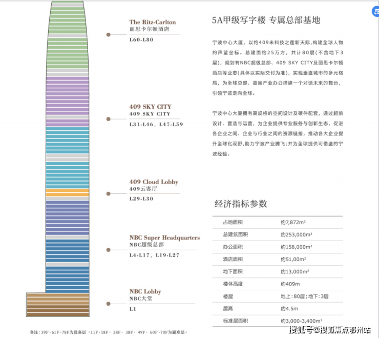 建筑面积:25.3万平方米,含24万㎡超甲级写字楼(1-60层)与1.3万㎡丽思卡尔顿酒店(61-80层)