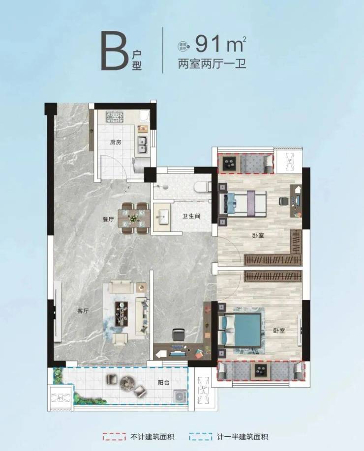 阳光·四季襄郡目前推出的为建面约91㎡两室两厅一卫,整体户型方正,拥有较大的横厅面积。